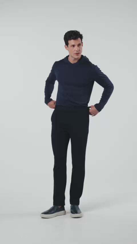 A malha, proveniente das renomadas tecelagens italianas, confere à peça um caimento impecável, fluidez e uma durabilidade superior. O design inteligente, com um cós meio elástico discreto, oferece um ajuste preciso e um conforto excepcional que se adapta ao seu movimento.